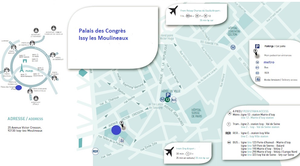 The conference venue is at only 3 minutes walking distance from the metro station Mairie d’Issy on Metro Line 8. In addition to Metro Line 12, the conference venue is also accessible by RER Line C, Tram Line 2, and several Bus Lines. Transportation from Charles de Gaulle Airport takes approximately 1 hour by public transports and 35 minutes by taxi. As for transportation from Orly Airport, it takes 30 minutes either by taxi or by public transports.