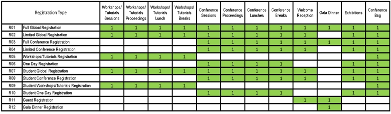 Workshops/Tutorials Sessions, Workshops/Tutorials Proceedings, Workshops/Tutorials Lunch, Workshops/Tutorials Coffee Breaks, Conference Sessions, Conference Proceedings, Conference Lunches, Conference Coffee Breaks, Welcome Reception, Gala Dinner, Exhibitions, Conference Bag.