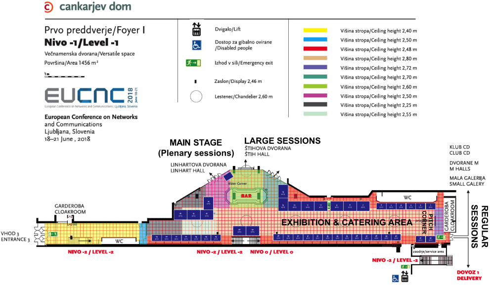 Another level below, i.e. Foyer 2 will also be available to EuCNC 2018 and will host the registration area, sessions in Kosovel and E halls, poster sessions, an open bar and areas for private meetings. Foyer 2 has a similar layout to Foyer 1, is connected to Foyer 1 with two staircases and accessible from large halls through the lower exists.