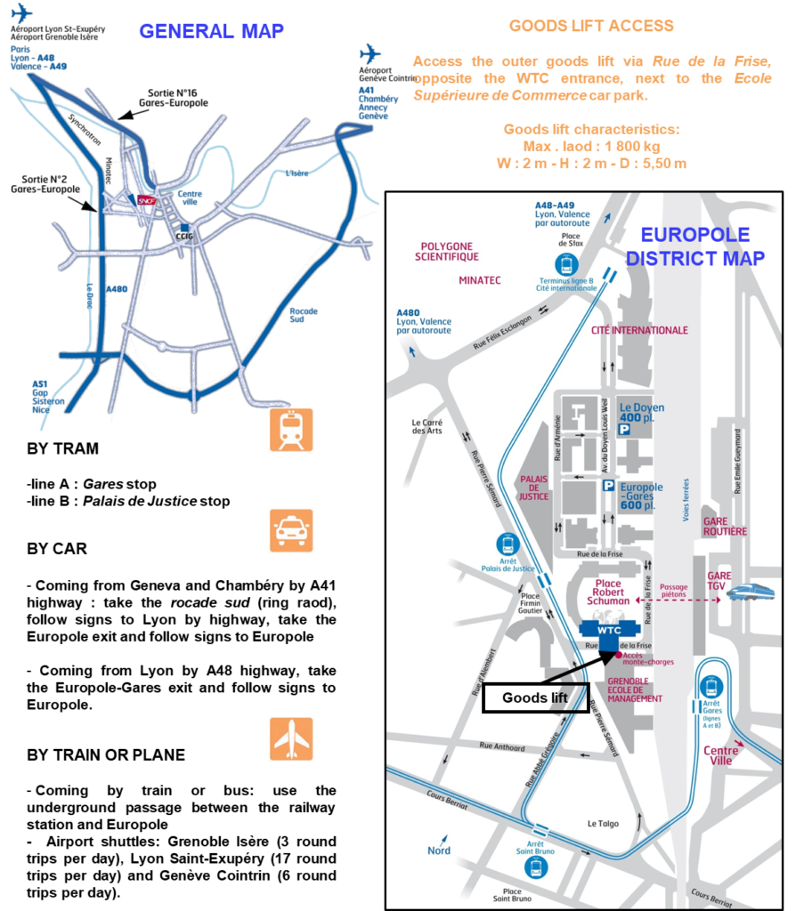 The WTC Grenoble Convention Centre does not have a loading bay. For heavy deliveries, the goods lift is accessed via rue de la Frise between the World Trade Center Grenoble and the Business School (see the access map on the last page).