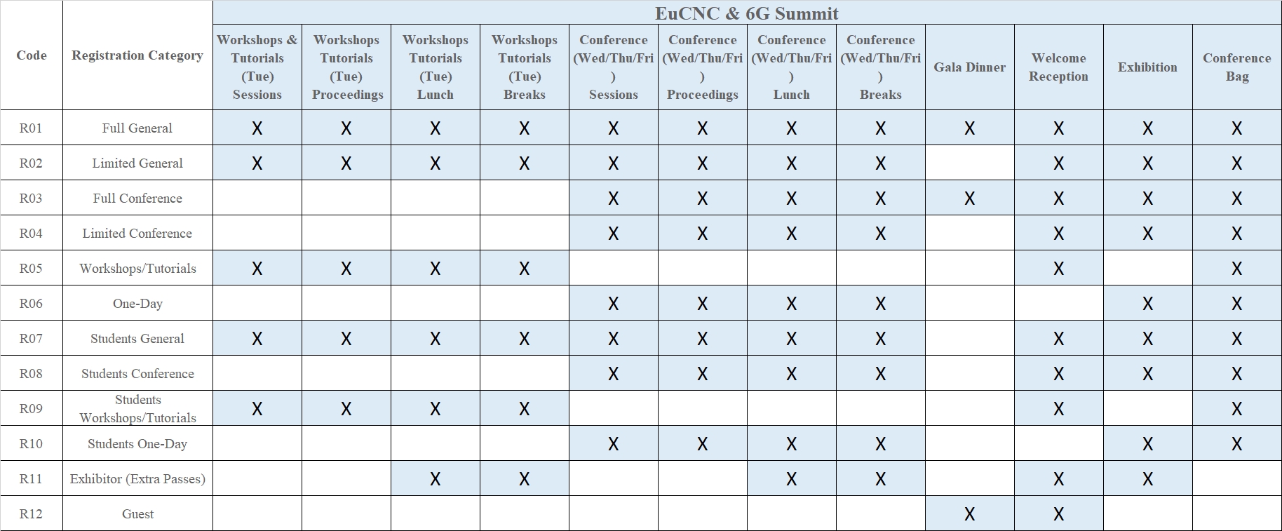 Workshops/Tutorials (Tue) Sessions, Workshops/Tutorials (Tue) Proceedings, Workshops/Tutorials (Tue) Lunch, Workshops/Tutorials (Tue) Breaks, Conference (Wed/Thu/Fri) Sessions, Conference (Wed/Thu/Fri) Proceedings, Conference (Wed/Thu) Lunches, Conference (Wed/Thu/Fri) Breaks, Gala Dinner, Welcome Reception, Exhibition, Conference Bag.