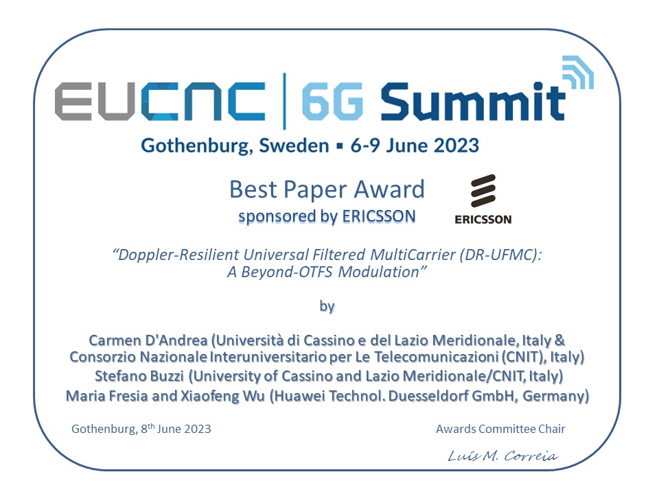 The Best Paper was awarded to the paper “Doppler-Resilient Universal Filtered MultiCarrier (DR-UFMC): A Beyond-OTFS Modulation“, by the authors Carmen D’Andrea (Università di Cassino e del Lazio Meridionale, Italy & Consorzio Nazionale Interuniversitario per Le Telecomunicazioni (CNIT), Italy), Stefano Buzzi (University of Cassino and Lazio Meridionale/CNIT, Italy), Maria Fresia and Xiaofeng Wu (Huawei Technol. Duesseldorf GmbH, Germany)