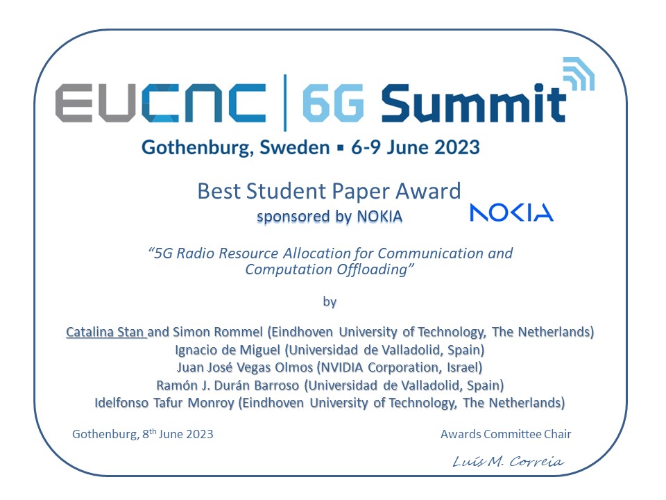 The Best Paper was awarded to the paper “5G Radio Resource Allocation for Communication and Computation Offloading“, by the authors Catalina Stan and Simon Rommel (Eindhoven University of Technology, The Netherlands), Ignacio de Miguel (Universidad de Valladolid, Spain), Juan José Vegas Olmos (NVIDIA Corporation, Israel), Ramón J. Durán Barroso (Universidad de Valladolid, Spain), Idelfonso Tafur Monroy (Eindhoven University of Technology, The Netherlands)