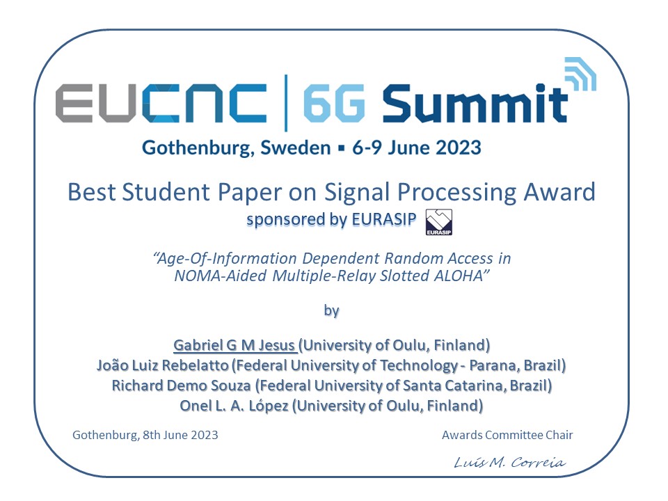 The Best Paper was awarded to the paper “Age-Of-Information Dependent Random Access in NOMA-Aided Multiple-Relay Slotted ALOHA“, by the authors Gabriel G M Jesus (University of Oulu, Finland), João Luiz Rebelatto (Federal University of Technology – Parana, Brazil), Richard Demo Souza (Federal University of Santa Catarina, Brazil), Onel L. A. López (University of Oulu, Finland)