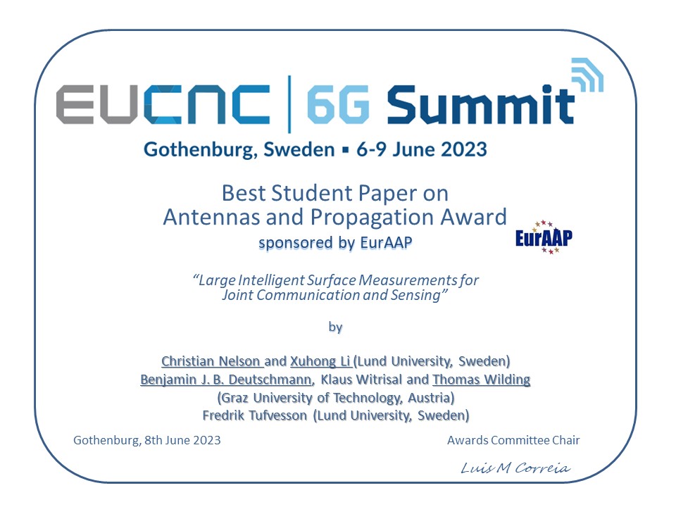The Best Paper was awarded to the paper “Large Intelligent Surface Measurements for Joint Communication and Sensing“, by the authors Christian Nelson and Xuhong Li (Lund University, Sweden), Benjamin J. B. Deutschmann, Klaus Witrisal and Thomas Wilding, (Graz University of Technology, Austria), Fredrik Tufvesson (Lund University, Sweden)